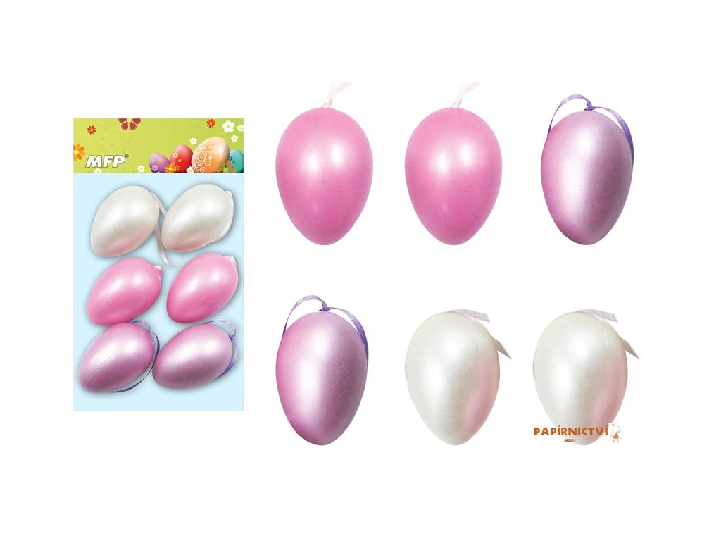 Velikonoční plastová vajíčka v lesklé růžové a bílé barvě. Vajíčka mají stužku na pověšení. Vyzdobte si svůj domov krásnými velikonočními vajíčky, které Vám vytvoří okouzlující atmosféru Velikonoc! Tuto dekoraci můžete použít na dekorování velikonočních věnců nebo větviček.