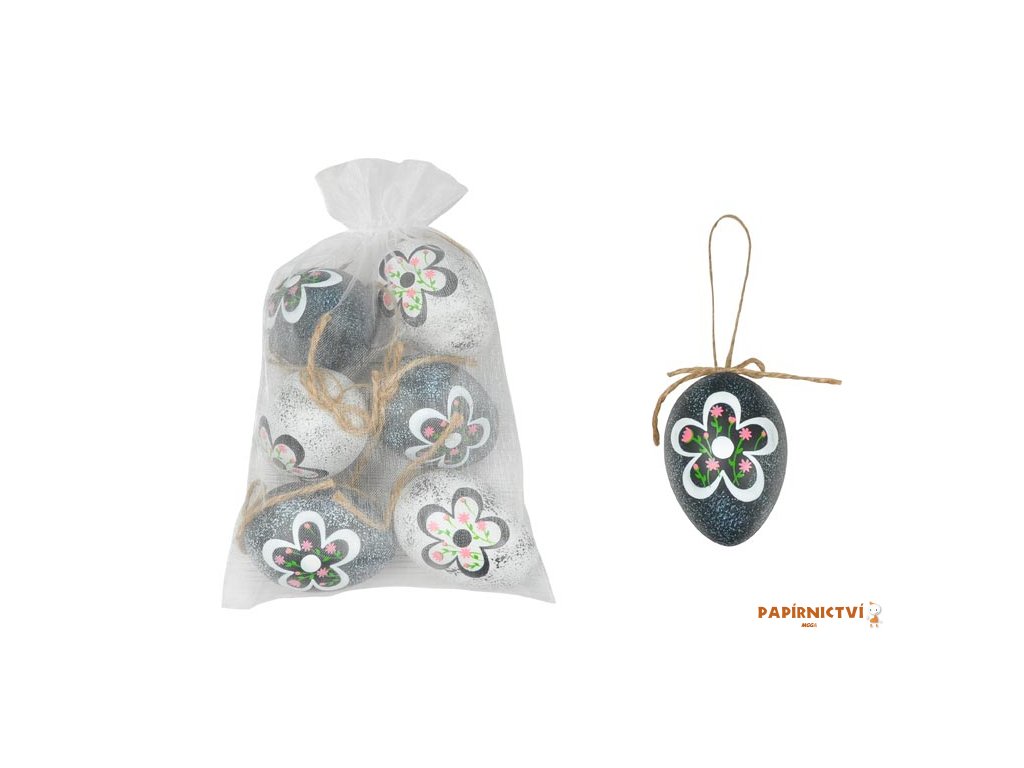 Vajíčka plastová v bíločerných barvách na zavěšení. Krásná velikonoční dekorace vajíčka se závěsem a motivem květu. Poslouží jako dekorace do exteriéru nebo interiéru. Dekorace má provázek na zavěšení. Nalaďte se s námi na Velikonoce!