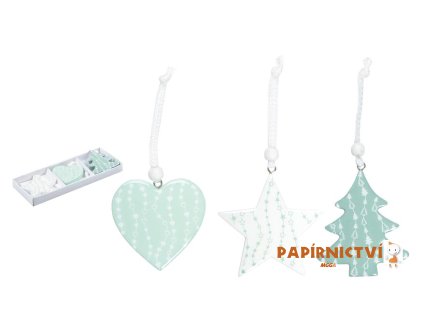 Vánoční ozdoby set 3 ks - srdíčko, stromeček a hvězda se závěsem. V horní části je očko s provázkem a korálkem, který umožňuje snadné zavěšení. Ozdobu můžete zavěsit na dveře,...
