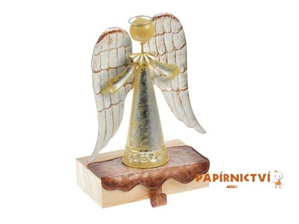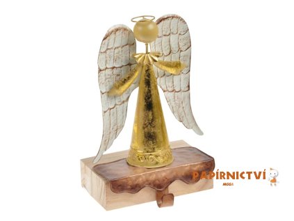 Originální plechová dekorace v podobě anděla. Spolehlivě zkrášlí každý kout místnosti. Plechový anděl má zlatou barvu a dřevěný podstavec s háčkem.