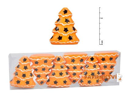 Vánoční ozdoba stromeček, v oranžové barvě, s potiskem černých hvězdiček. Ideální na výzdobu do oken či na vánoční stromeček.