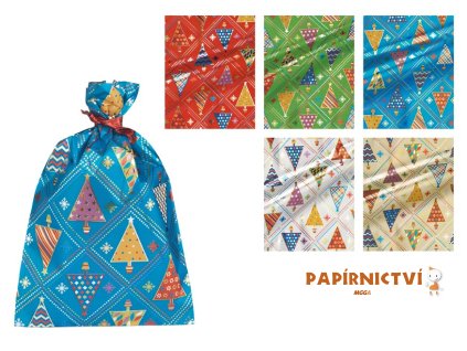 Vánoční dárkový sáček s motivem vánočních stromečků v mixu barev. Vyrobený z luxusního celofánu s potiskem. Skvělý na zabalení drobných dárků. Sáček můžete uzavřít vázací stuhou...