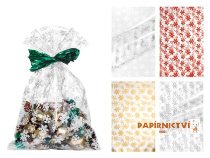 Vánoční průhledný dárkový sáček s motivem vloček v bílé, červené, zlaté nebo stříbrné barvě. Vyrobený z luxusního celofánu s potiskem. Skvělý na zabalení drobných dárků. Sáček...