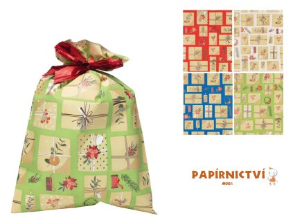Vánoční dárkový sáček, vyrobený z lesklého materiálu, zdobený jemným potiskem vánočních motivů. Umožňuje snadno zabalit různé druhy drobných dárků bez nutnosti použití balicího...