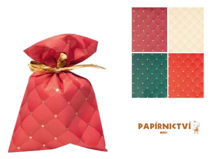 Vánoční dárkový sáček, vyrobený z lesklého materiálu, zdobený motivem připomínajícím prošívaný vzor s malými zlatými tečkami. Umožňuje snadno zabalit různé druhy drobných dárků...