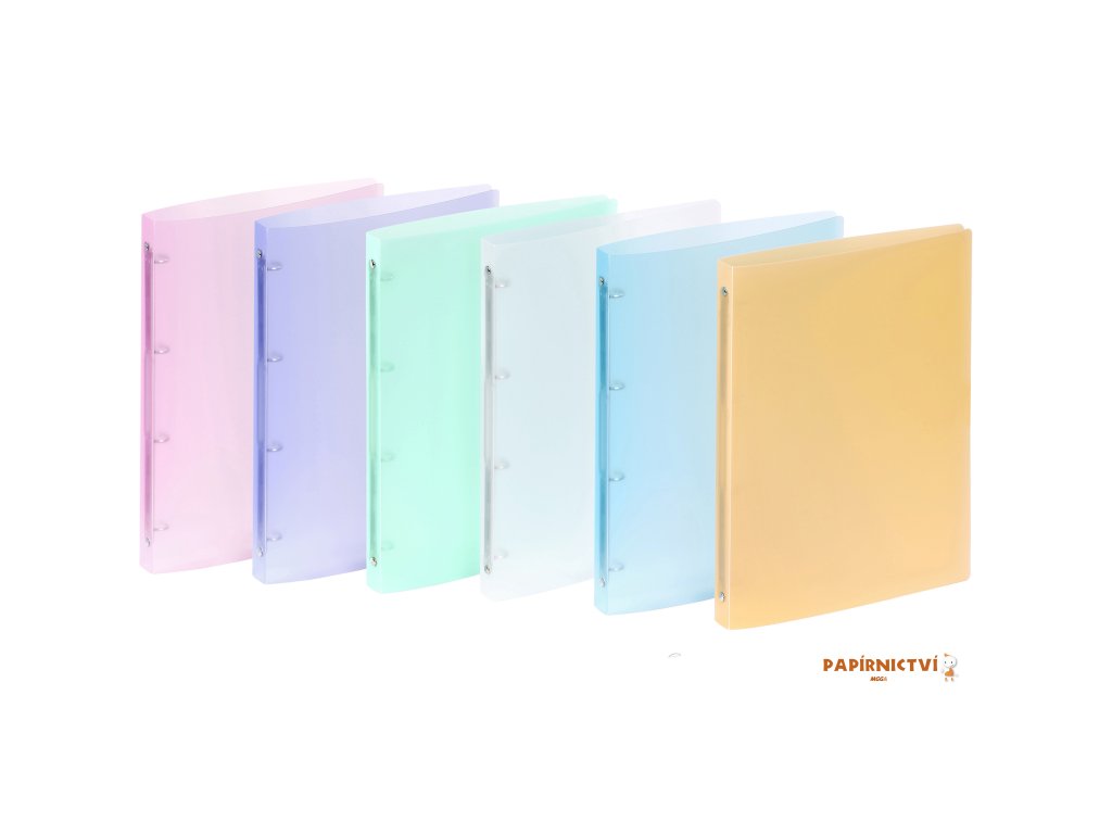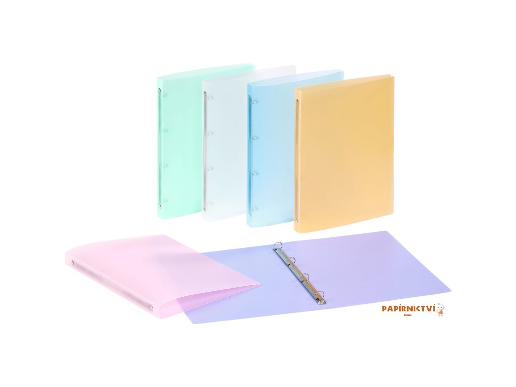 - 4 kroužkový PP pořadač z kolekce Propysoft - rozměr 24,3 x 31,5 cm - hřbet 2,5 cm - průměr kroužků 1,5 cm - průhledné PP desky (0,5 mm) v 6 pastelových barvách - kapacita 100 listů - vyrobeno ve FranciiDoplňkové parametry