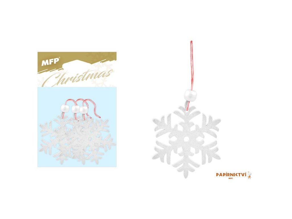 Vánoční dekorace vyřezávaná vločka stříbrná s bílým perleťovým korálkem. Vánoční ozdoba je opatřena provázkem na zavěšení. Můžete ji použít na ozdobení vánočního stromečku, zavěsit na dveře, okno, nebo jinak zkrášlit Vaše bydlení.BALENÍ OBSAHUJE: