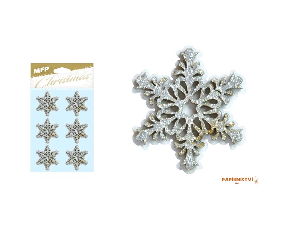 Vločky dřevo stříbrné gliter 6ks se samolepkou 8886115