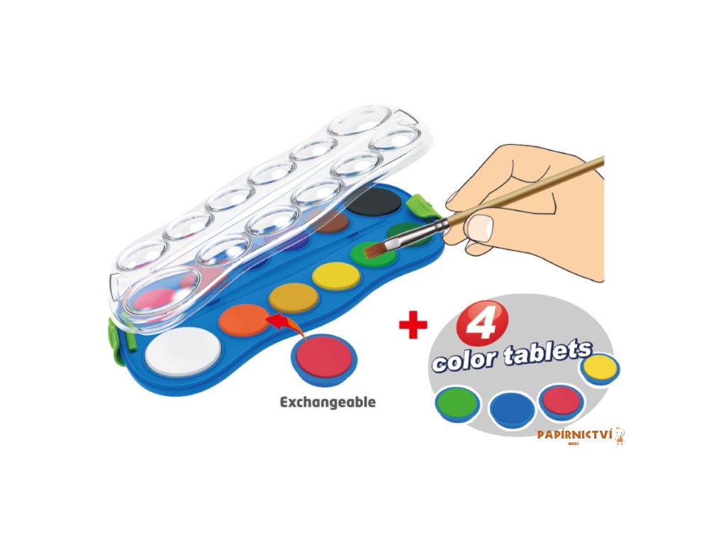 Vodové barvy s malírskou paletou v atraktivním designu. Balení obsahuje 12 barev + 4 vymenitelné barvy vcetne malírského štetce. Vodové barvy jsou urceny pro školu i volný cas. Vysoká pigmentace vytvárí jasné a zárivé barvy s vysokými krycími vlastnosti.Doplňkové parametry
