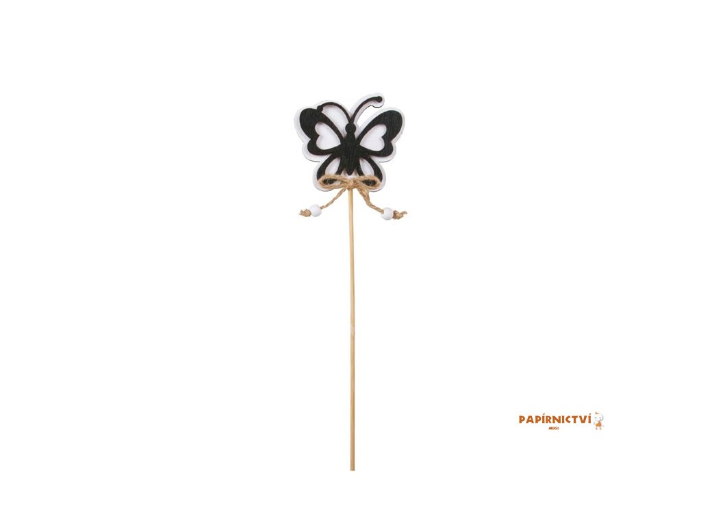 Velikonoční dekorace, zápich dřevěný motýl v černé barvě. Černý vyřezávaný motýl je na světlém podkladu, ozdobený jutovou mašličkou s korálky. Zápich je vhodný do jarních dekorací nebo květináčů.Barva: černá