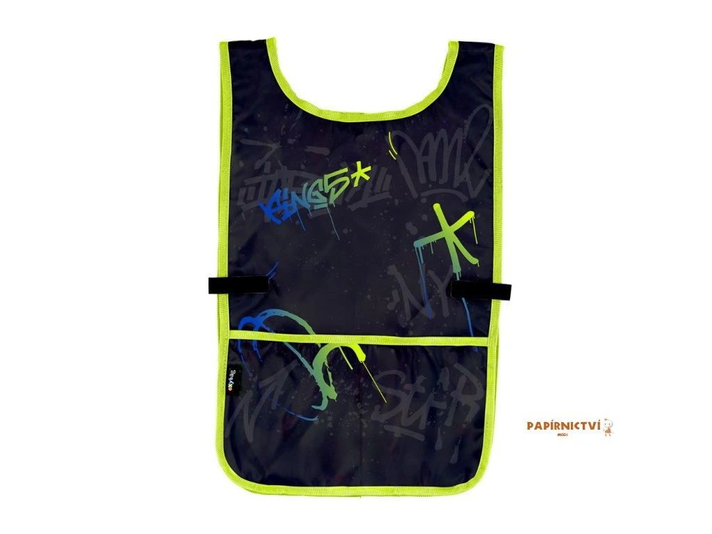 Zástěra pončo do výtvarné výchovy či na jiné tvořící aktivity. Oblékání přes hlavu, po stranách zapínání na druk. Vpředu jedna prostorná kapsa. Materiál 100% polyester..