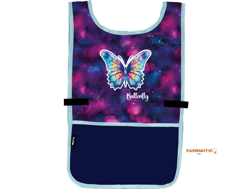 Zástěra pončo do výtvarné výchovy či na jiné tvořící aktivity. Oblékání přes hlavu, po stranách zapínání na druk. Vpředu jedna prostorná kapsa. Materiál 100% polyester.