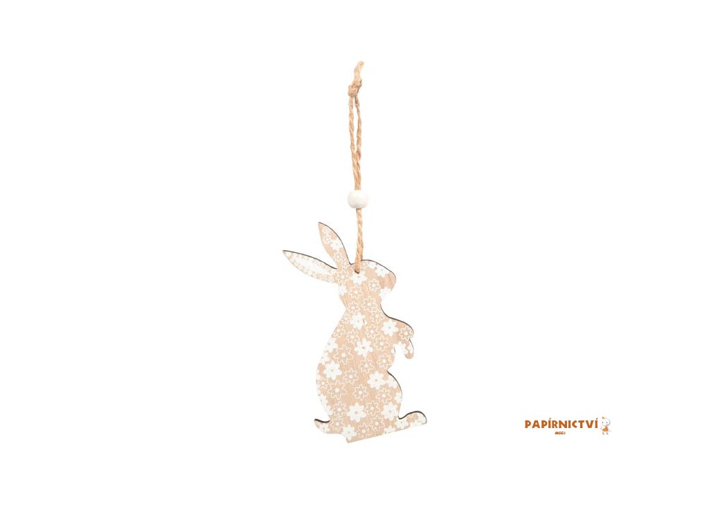Krásná velikonoční dekorace ze dřeva zajíc v přírodní barvě s bílými květy na pověšení. Dekorace je opatřena jutovou šňůrkou s korálkem pro snadné pověšení. Poslouží jako dekorace do exteriéru nebo interiéru.Balení obsahuje: