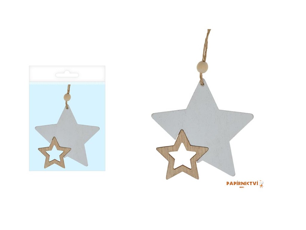 Dřevěná vánoční dekorace ve tvaru hvězdy se závěsem. Tato dekorace je opatřena očkem a provázkem s korálkem na zavěšení. Můžete ji použít na ozdobení vánočního stromečku, zavěsit na dveře, okno, nebo jinak zkrášlit Vaše bydlení.Barva: bílá