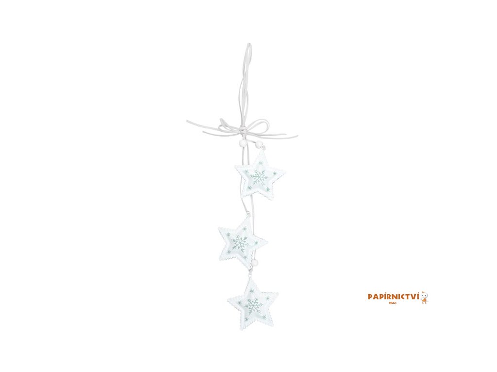Vánoční ozdoba hvězdy se závěsem. Závěs obsahuje 3 hvězdy. V horní části je očko s provázkem a korálkem, který umožňuje snadné zavěšení. Ozdobu můžete zavěsit na dveře, okno, nebo jinak zkrášlit vaše bydlení.Délka: 380 mm