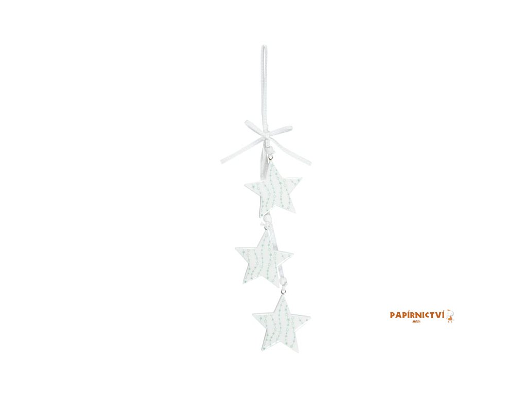 Vánoční dřevěná dekorace 3 hvězdy se závěsem. Hvězdy jsou vyřezány z lisovaného dřeva a jsou umístěni za sebou v závěsu. V horní části je očko s provázkem a korálkem, který umožňuje snadné zavěšení. Ozdobu můžete zavěsit na dveře, okno, nebo jinak zkrášlit Vaše bydlení.Délka: 400 mm