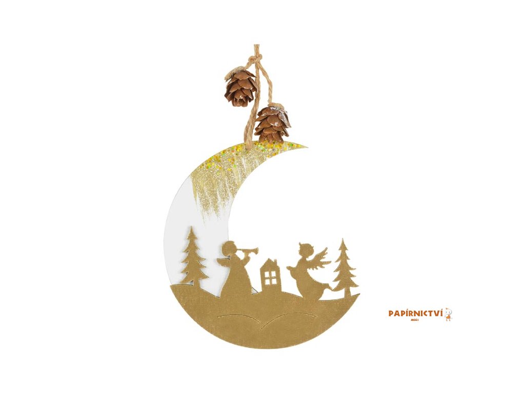 Vánoční dřevěná dekorace ve tvaru měsíce se závěsem. Dekorace je vyrobena ze dřeva s šiškami a provázkem, který umožňuje snadné zavěšení. Lze použít na různé dekorace jako zavěsit na dveře či okno. Dřevěné ozdoby mají tu výhodu, že se při pádu hned nerozbijí a můžete si tak zkrášlit vaše bydlení.Materiál: dřevo