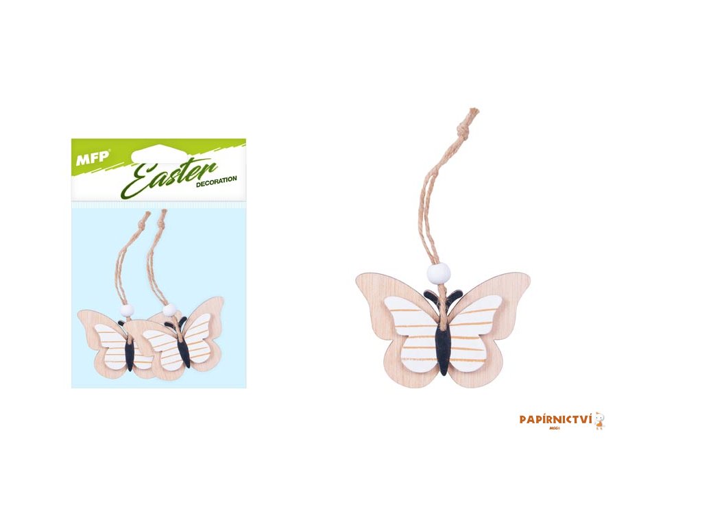 Krásná velikonoční dekorace v designu dřevěného motýla se závěsem. Poslouží jako dekorace do exteriéru nebo na zkrášlení interiéru. Dekorace má provázek s korálkem na zavěšení.Balení obsahuje: