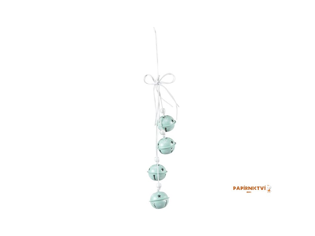 Vánoční dekorace rolničky v zelené barvě se závěsem. Závěs obsahuje 4 rolničky. V horní části je očko s provázkem, které umožňuje snadné zavěšení. Ozdobu můžete zavěsit na dveře, okno, nebo jinak zkrášlit Vaše bydlení.Délka: 350 mm