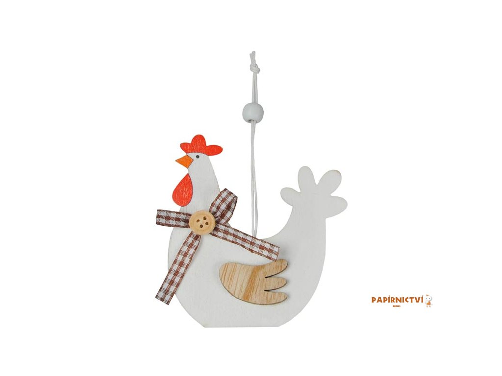 Krásná velikonoční dekorace v designu dřevěné bílé slepičky se závěsem, poslouží jako dekorace do exteriéru nebo na zkrášlení interiéru. Dekorace má provázek na zavěšení.Velikost: 90 mm