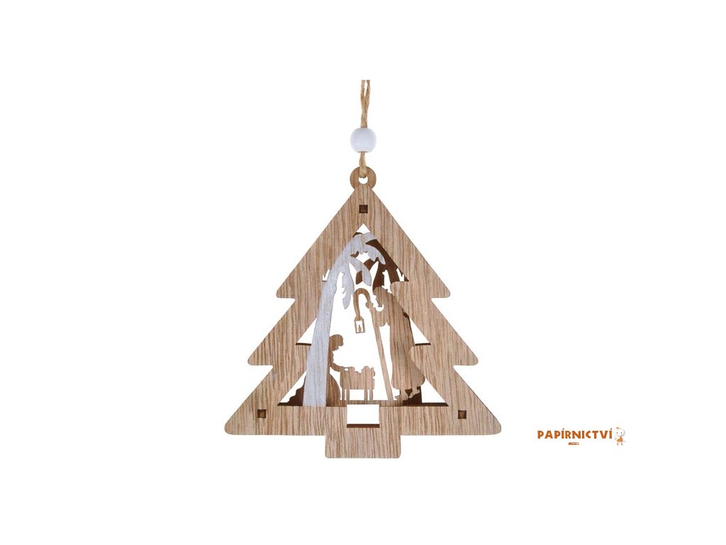 Dřevěná vánoční dekorace 3D vánoční stromeček. Uprostřed je motiv Ježíška v kolíbce s Josefem a Marií. Tato dekorace je opatřena očkem a provázkem s korálkem na zavěšení. Ideální na zavěšení do okna nebo jako vánoční ozdoba.Velikost: 100 mm