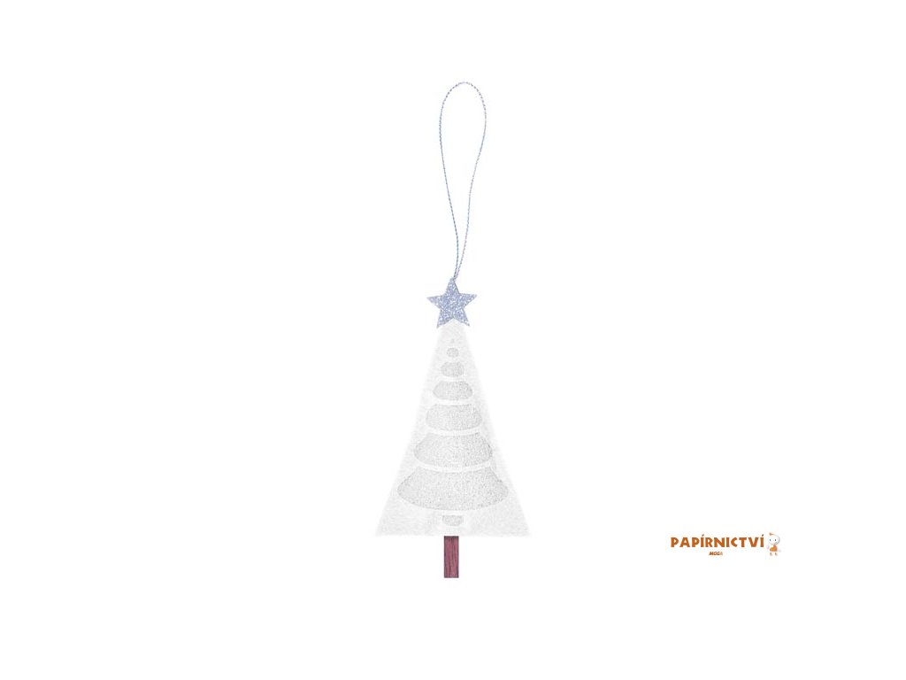 Vánoční dekorace stromek na zavěšení, v bílé barvě se stříbrnou hvězdou. Krásný závěs stromek z filcu je opatřený provázkem na zavěšení. Můžete ho pověsit na stromeček, do okna nebo na dveře. Zkrášlí tak váš interiér, a umocní vánoční atmosféru.Velikost: 65 mm
