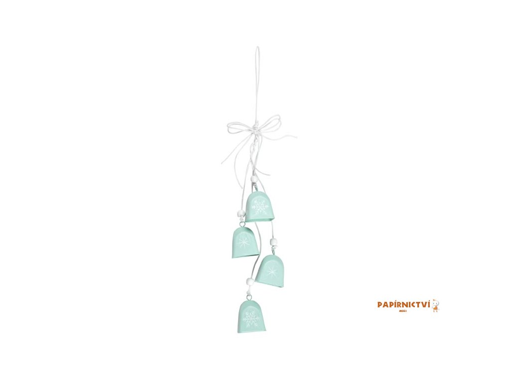 Vánoční dekorace zvonky v zelené barvě se závěsem. Závěs obsahuje 4 zvonečky. V horní části je očko s provázkem, které umožňuje snadné zavěšení. Ozdobu můžete zavěsit na dveře, okno, nebo jinak zkrášlit Vaše bydlení.Délka: 370 mm