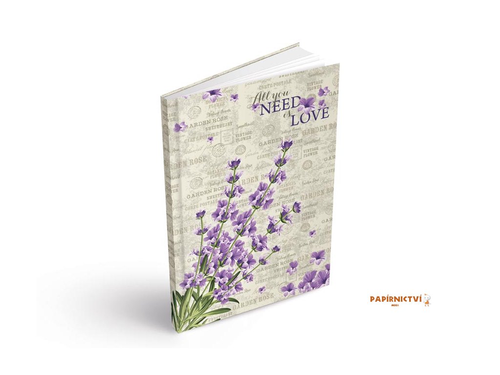 Záznamová kniha MFP bez linek. Desky jsou z pevného lepeného kartonu s laminem. Na titulní straně jsou levandule a nápis All you nees is love. Tyto bloky jsou opatřeny vazbou V8, která patří mezi nejpropracovanější a nejpevnější vazby.Formát: A5