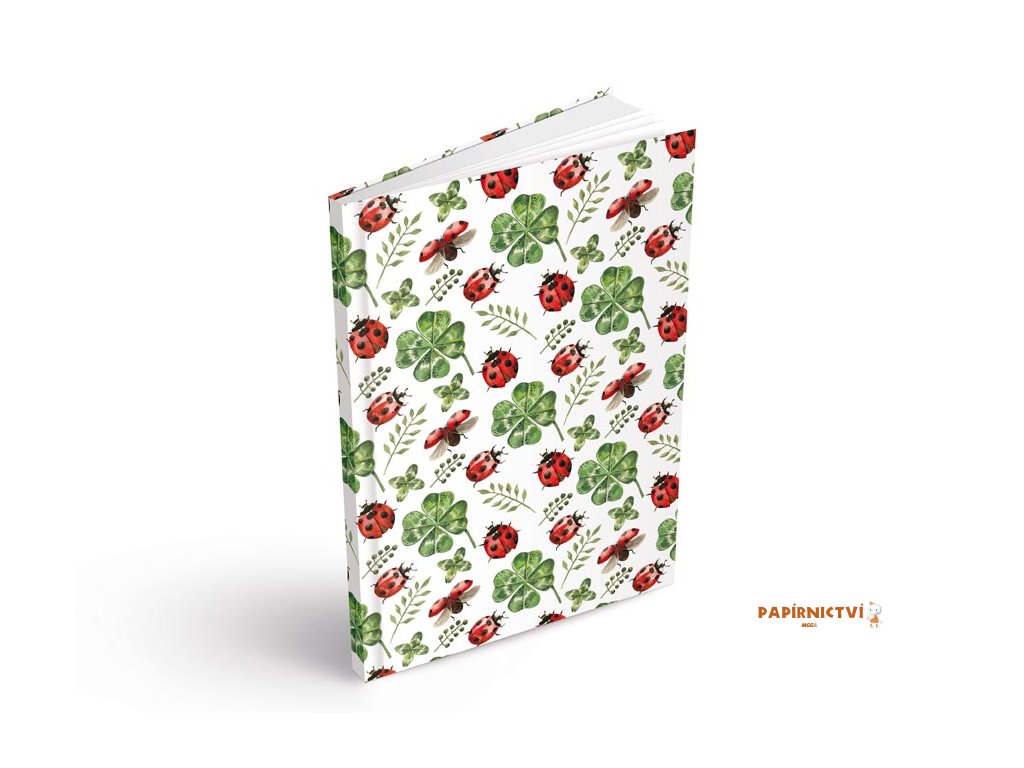 Záznamová kniha MFP s linkou. Desky jsou z pevného lepeného kartonu s laminem. Na titulní straně jsou berušky a čtyřlístky. Tyto bloky jsou opatřeny vazbou V8, která patří mezi nejpropracovanější a nejpevnější vazby.Formát: A5