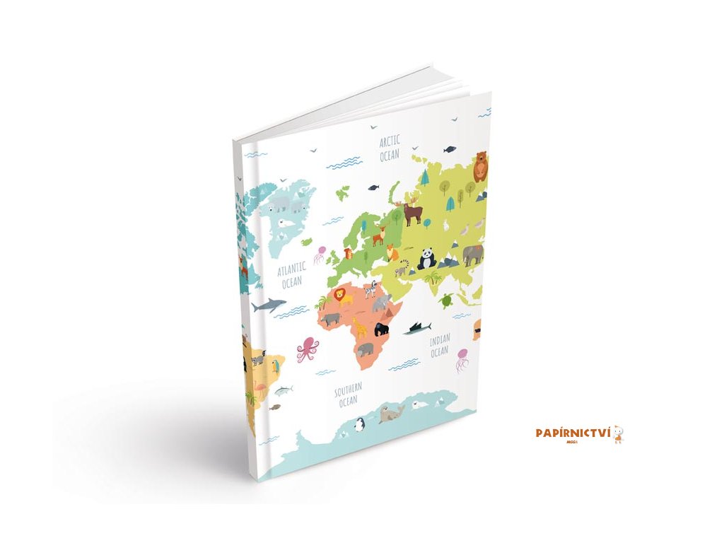 Záznamová kniha MFP ve formátu A5, linkovaná, s motivem mapy světa, na které jsou znázorněna zvířata charakteristická pro jednotlivé kontinenty. Je perfektní pro zapisování poznámek ve škole, v kanceláři nebo na schůzkách, a zároveň skvěle poslouží jako deník, plánovač či zápisník pro vaše nápady a úkoly. Desky jsou vyrobeny z pevného lepeného kartonu pokrytého laminem, což zajišťuje odolnost. Díky vazbě V8, známé svou mimořádnou pevností, zůstanou stránky bezpečně na svém místě i při častém používání.Formát: A5
