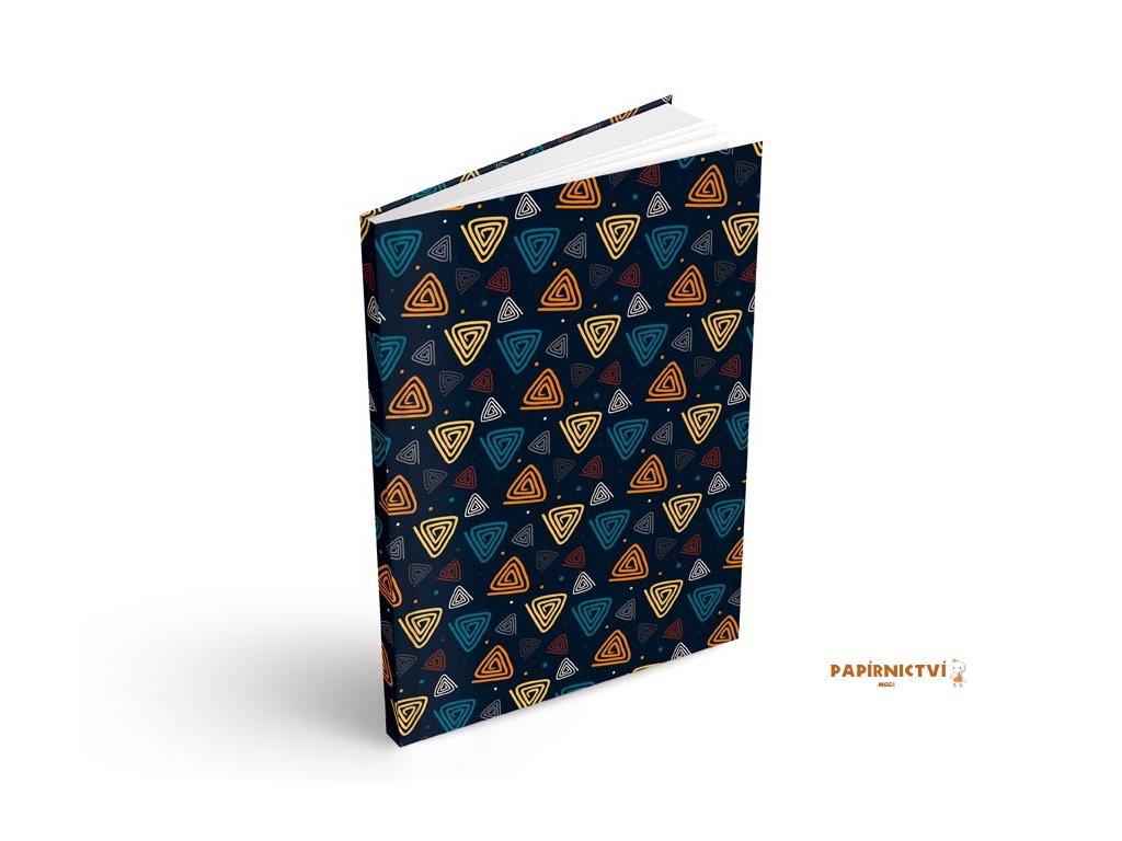 Záznamová kniha MFP ve formátu A5, linkovaná, s výrazným geometrickým motivem tvořeným trojúhelníky na tmavě modrém podkladu. Je perfektní pro zapisování poznámek ve škole, v kanceláři nebo na schůzkách, a zároveň skvěle poslouží jako deník, plánovač či zápisník pro vaše nápady a úkoly. Desky jsou vyrobeny z pevného lepeného kartonu pokrytého laminem, což zajišťuje odolnost. Díky vazbě V8, známé svou mimořádnou pevností, zůstanou stránky bezpečně na svém místě i při častém používání.Formát: A5