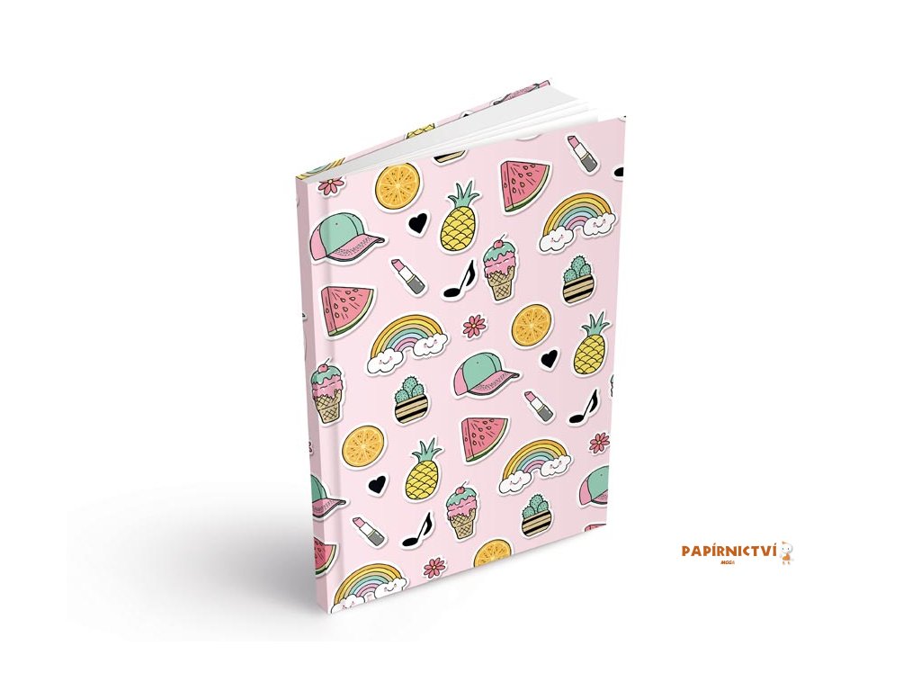 Záznamová kniha MFP ve formátu A6, linkovaná, s motivem veselých a hravých symbolů léta a zábavy jako jsou melouny, ananasy, zmrzliny, duhy, kšiltovky, rtěnky a další. Je perfektním společníkem pro každodenní poznámky, zápisky nebo kreativní nápady. Díky kompaktním rozměrům ho snadno uložíte do kabelky či batohu, takže ho můžete mít vždy po ruce. Díky vazbě V8, známé svou mimořádnou pevností, zůstanou stránky bezpečně na svém místě i při častém používání.Formát: A6