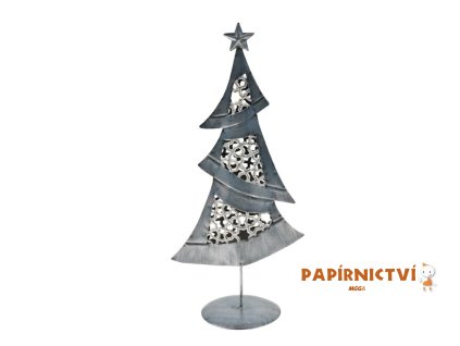Stromek plechový stříbrný s 3D efektem. Vánoční stromek je vyřezávaný a má podstavec. Lze umístit na jakoukoliv plochu ke zkrášlení místnosti.